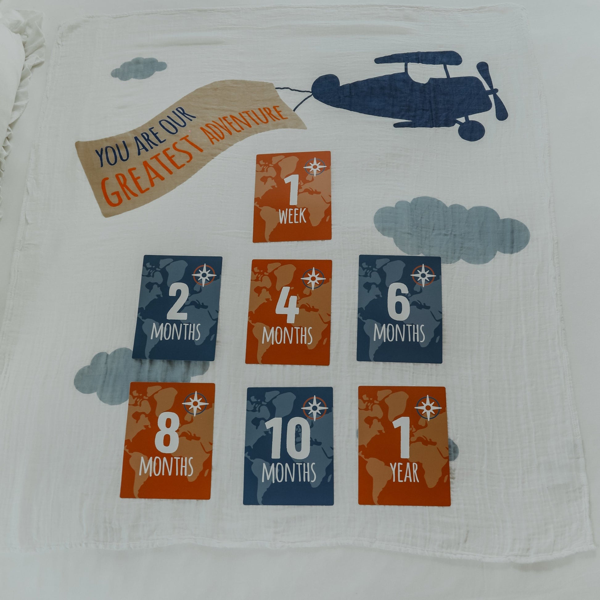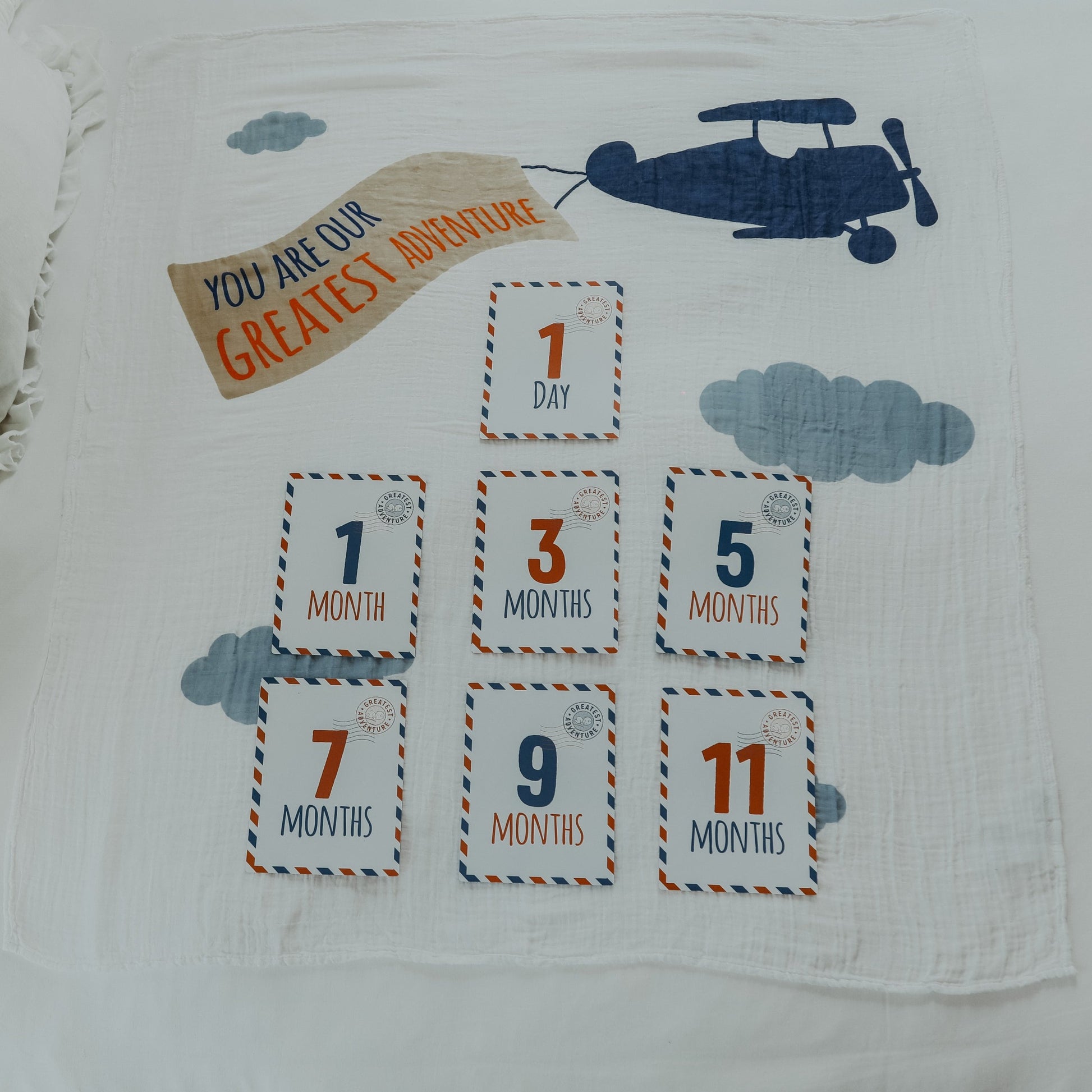 Size: 1 Large Muslin Blanket (40"x40") + 7 double-sided cards with 14 milestones.