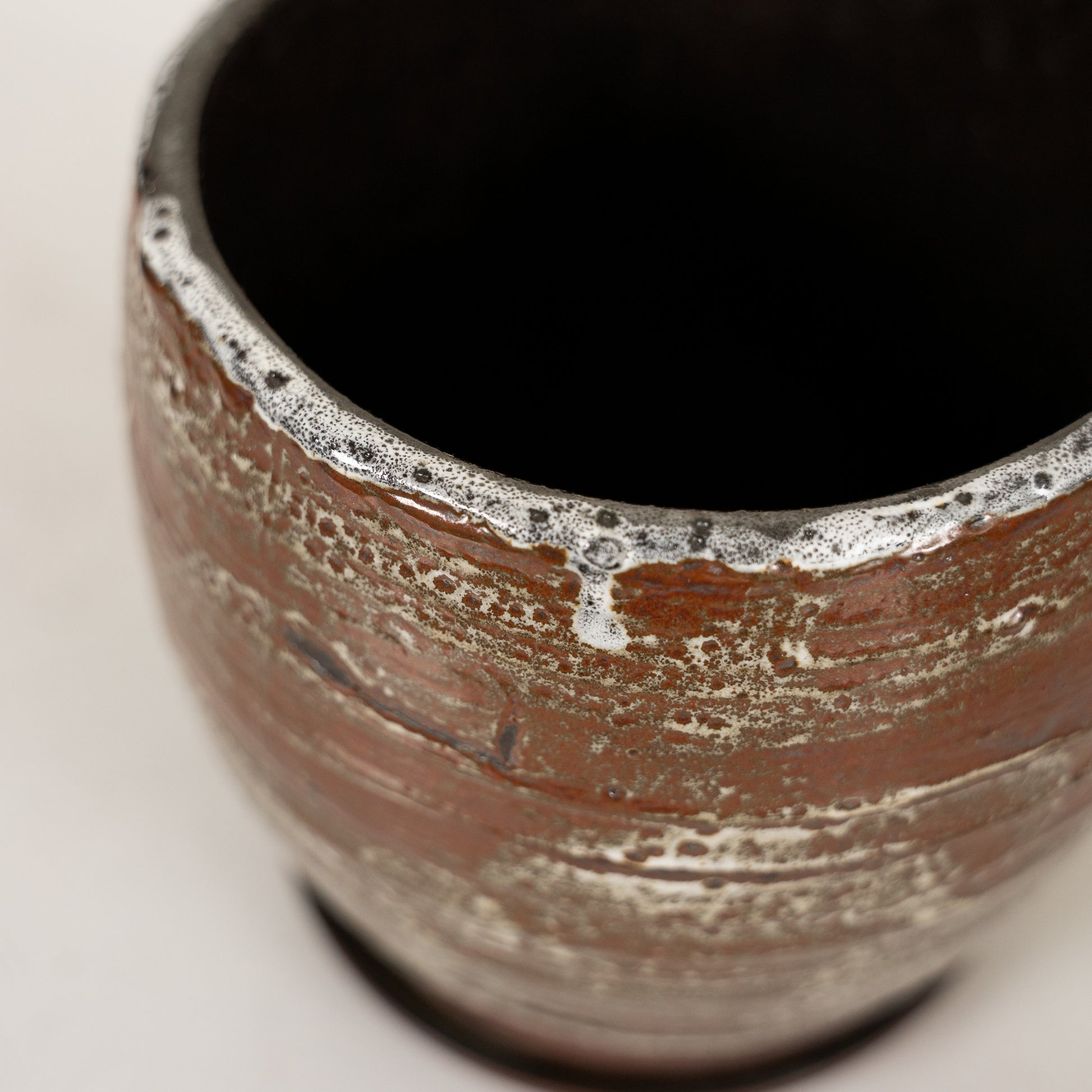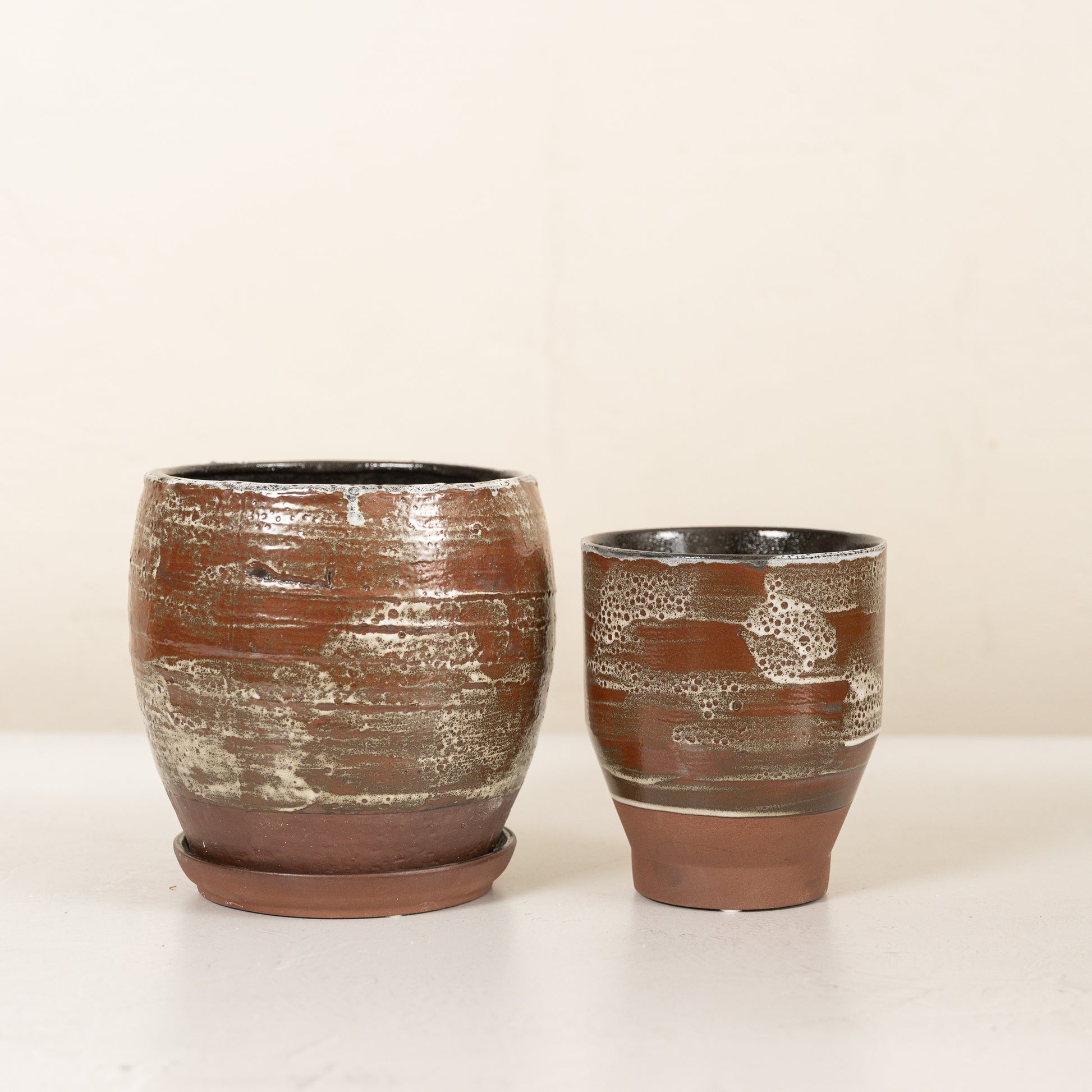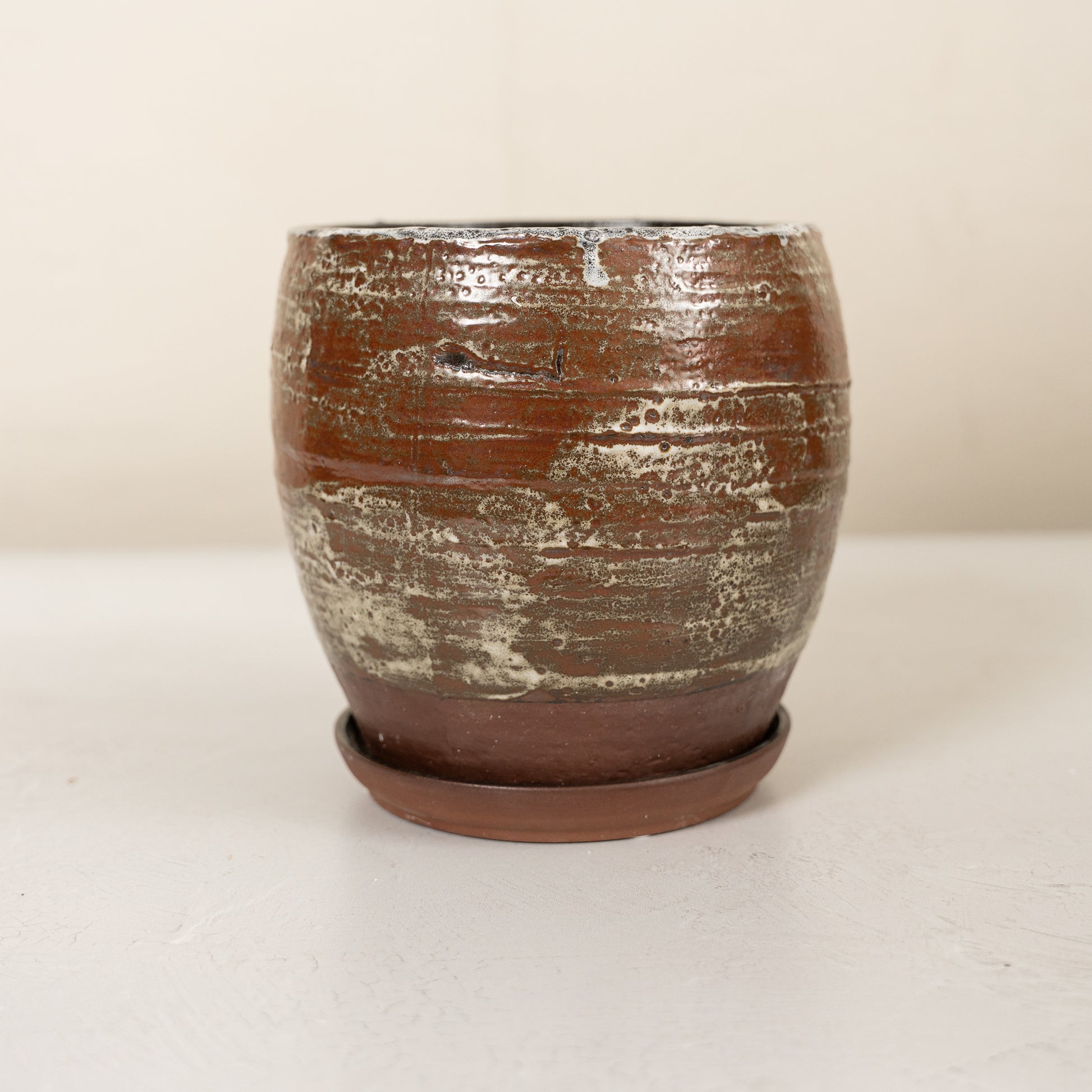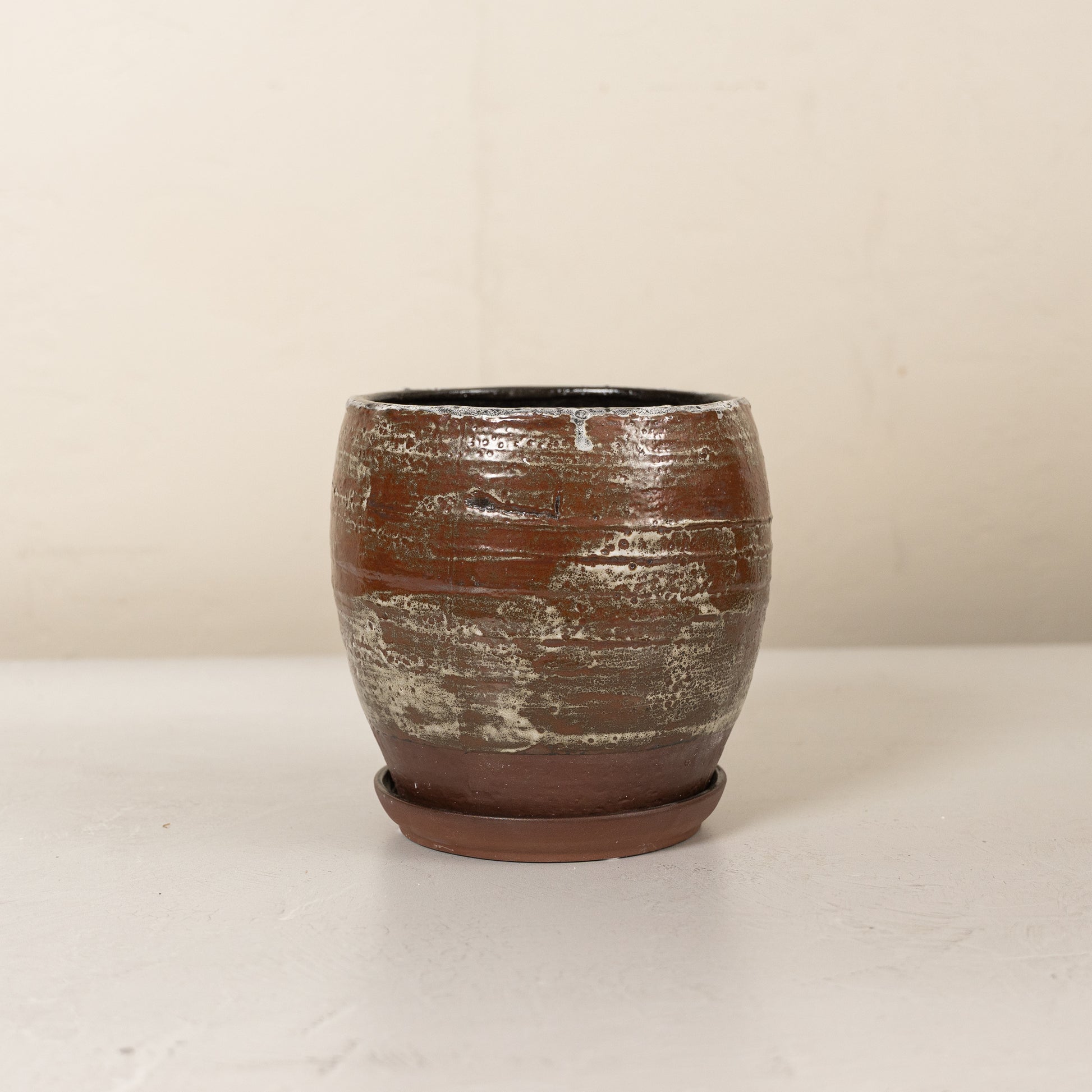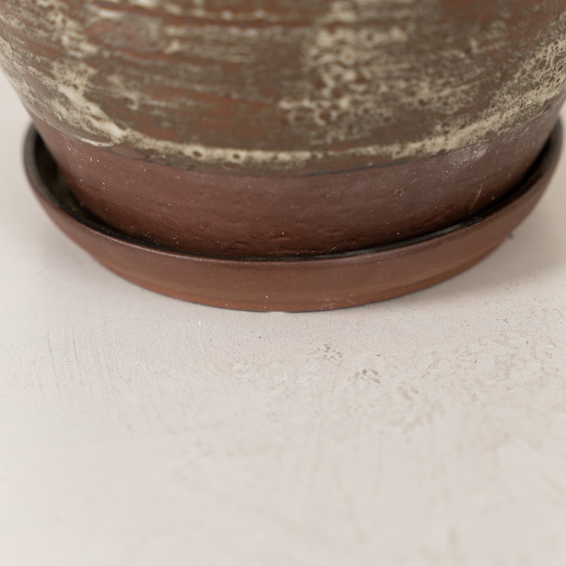This earth-toned small planter has an attached saucer and a reactive glaze. It is the perfect container for your small plants and succulents.