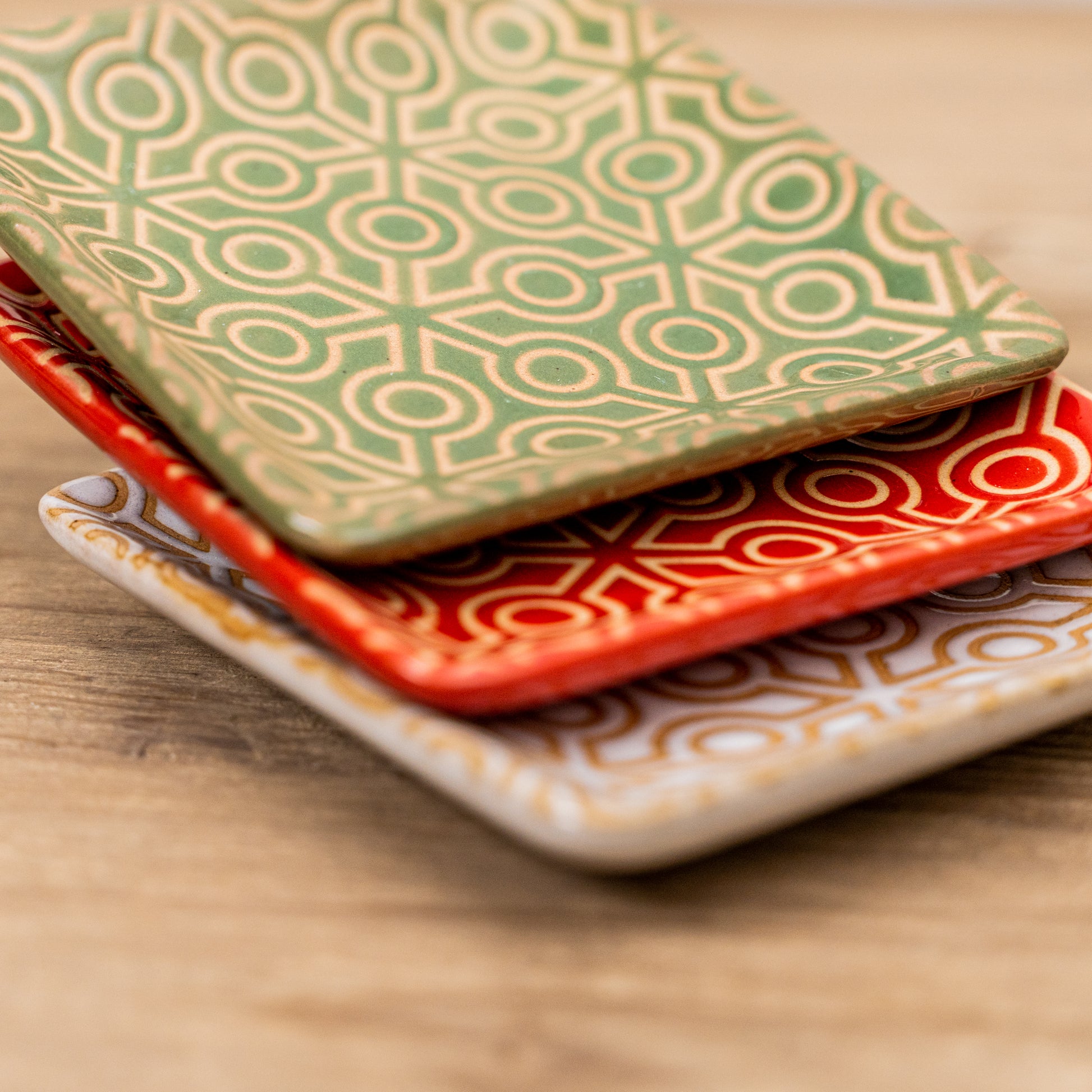 These debossed stoneware plates are perfect for serving candy, snacks, and appetizers during your holiday entertainment. Mix and match green, red, and white.