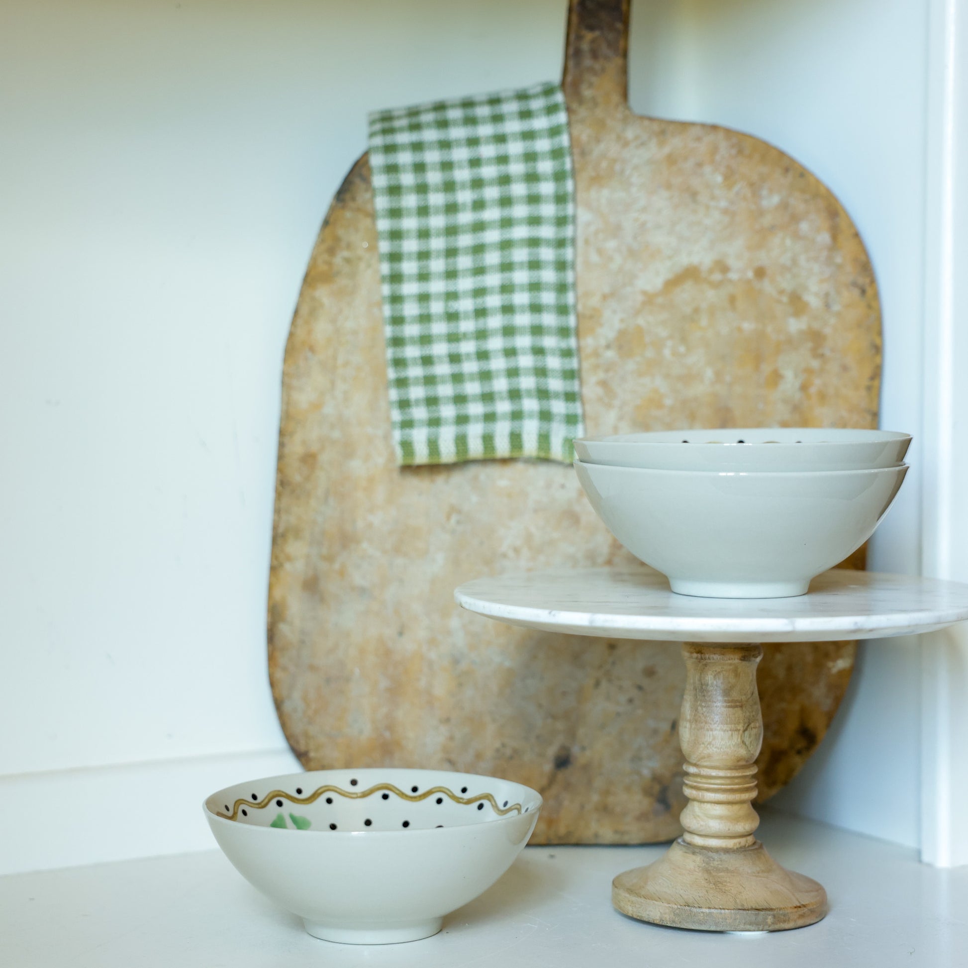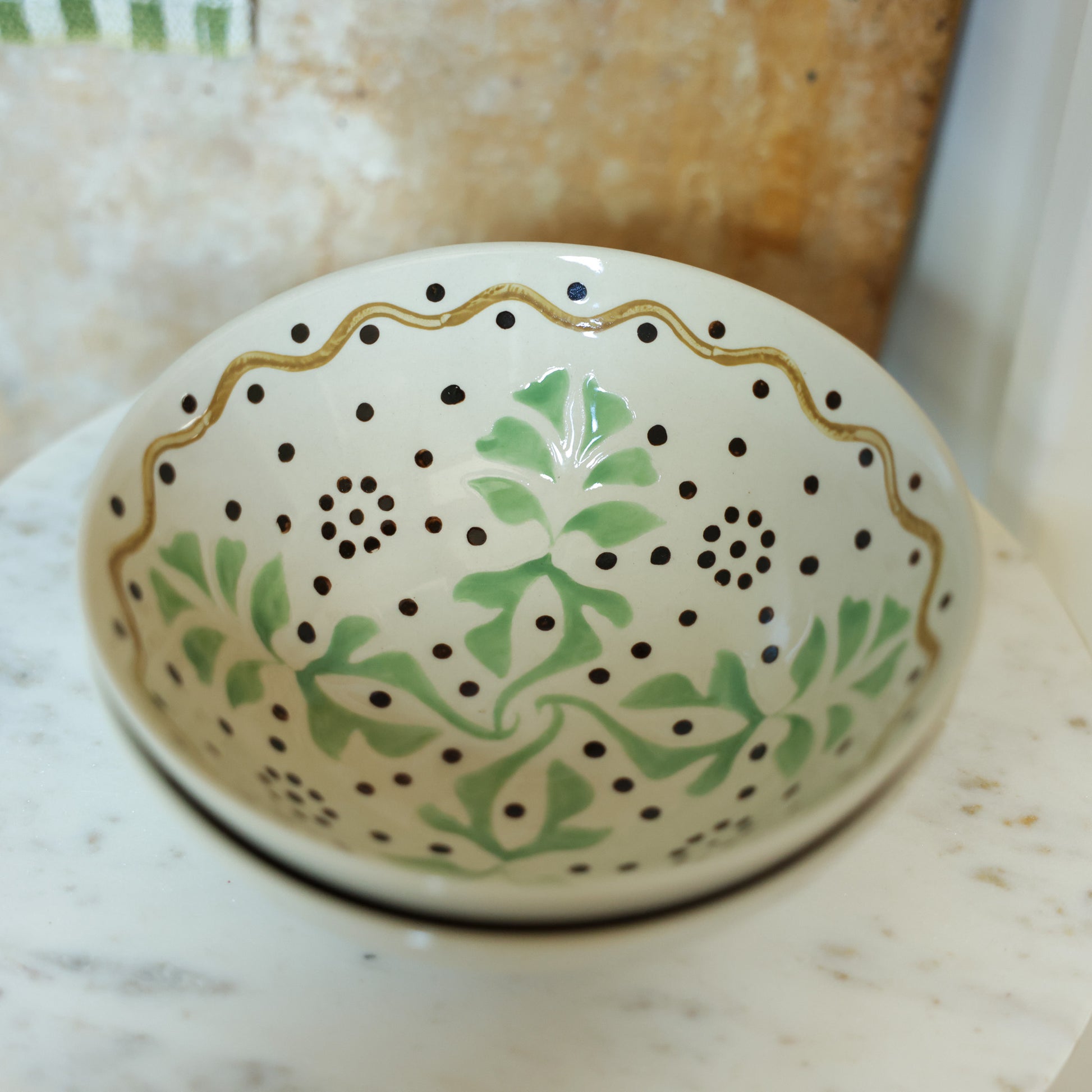 Add a pop of color to your table with our Dotted Painted Bowl. Hand-painted on durable stoneware, this 7-1/2" round serving bowl boasts a unique design in vibrant shades of green and brown. Perfect for serving salads, sides, or as a decorative piece, this bowl is both stylish and functional.