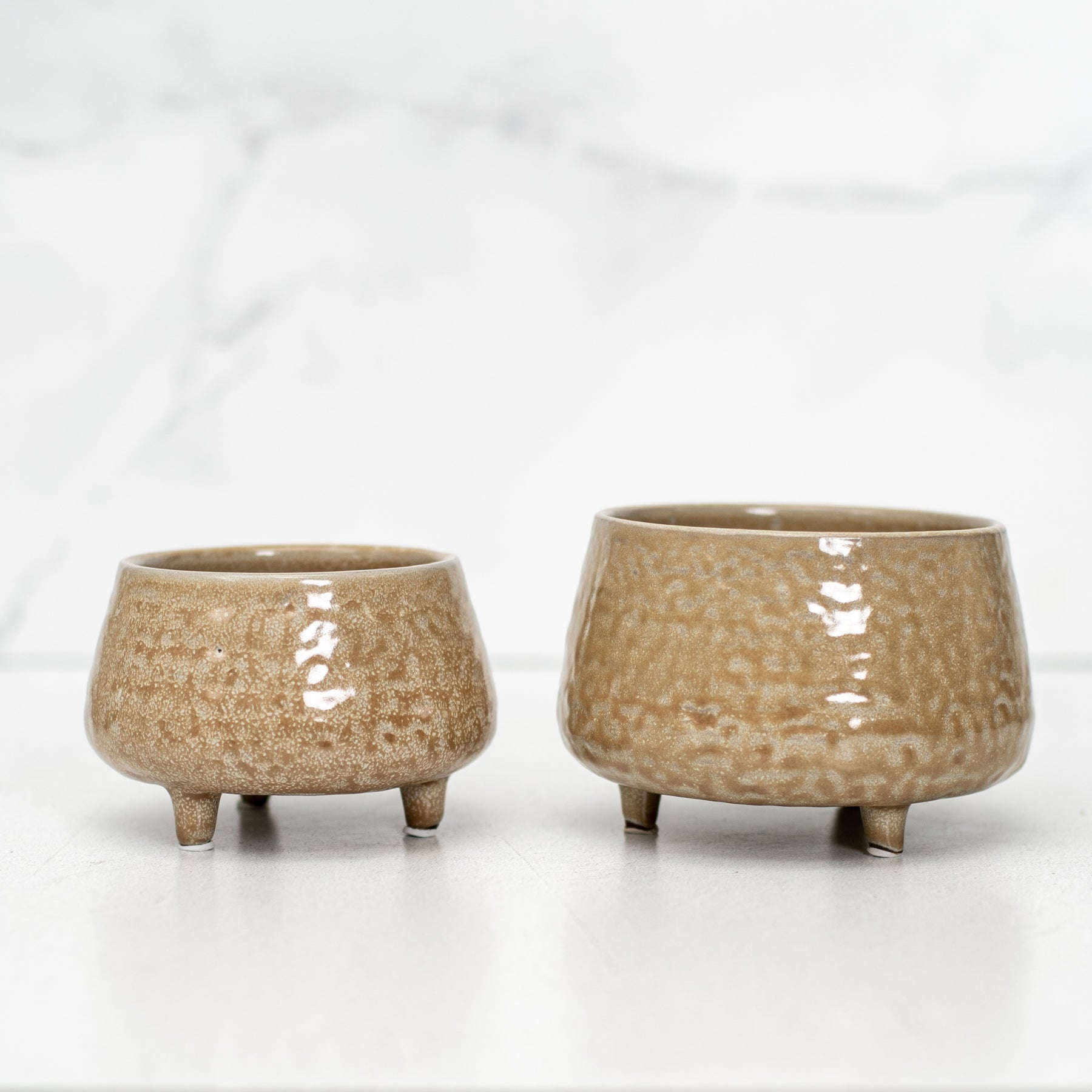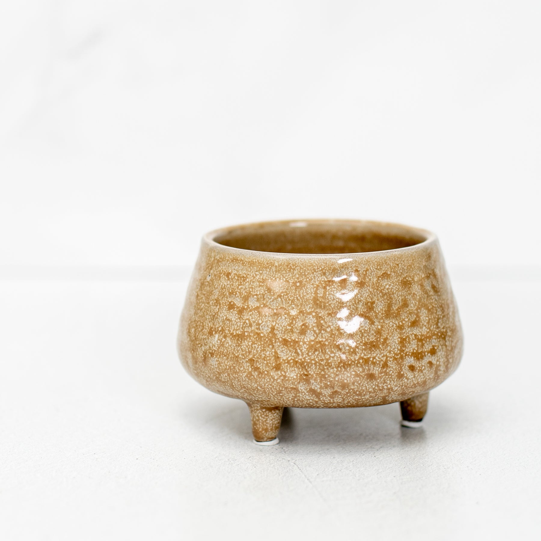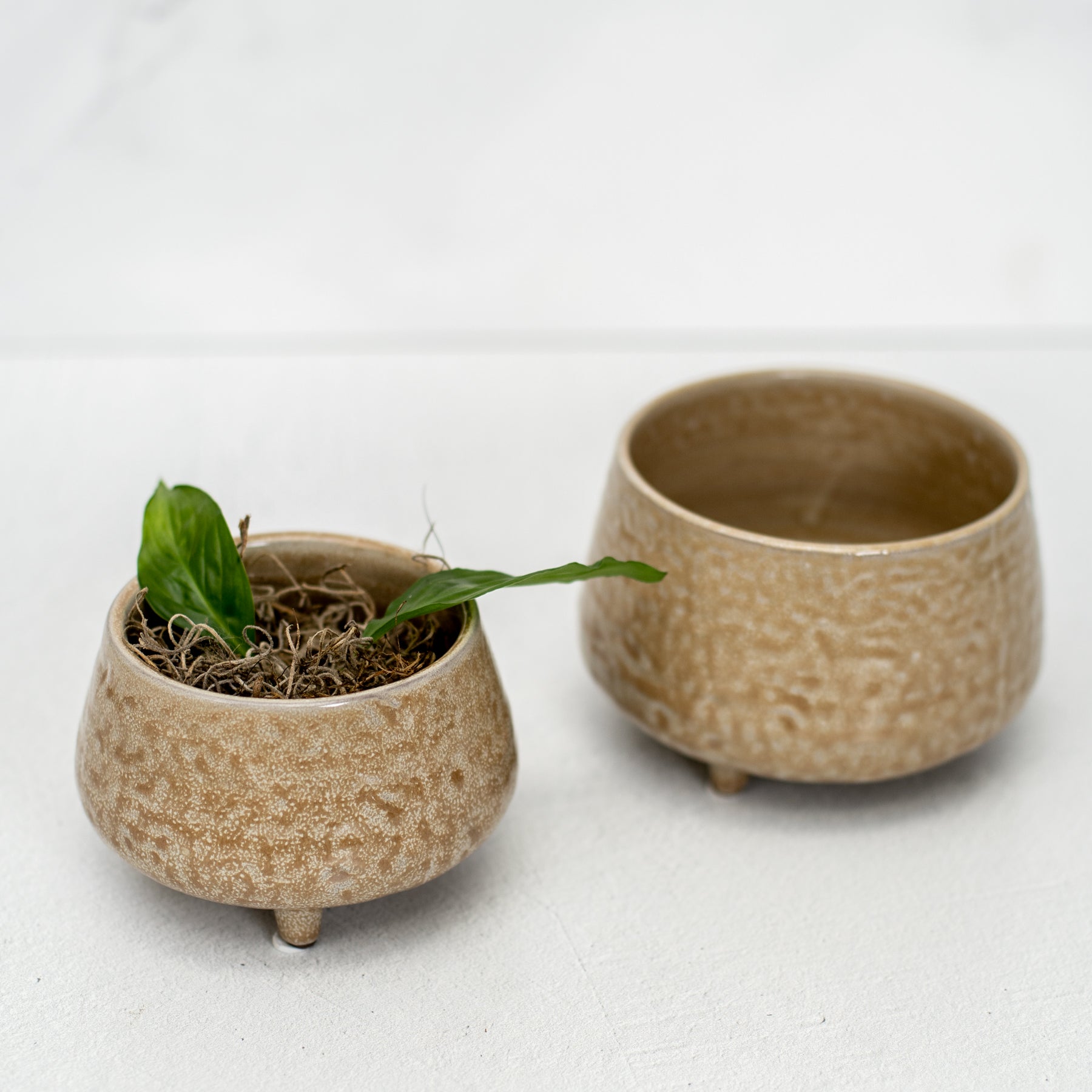 This stoneware planter has a reactive glaze that gives it texture and color variation throughout. Fill with decorative flowers or greenery to display on a tabletop or shelf.