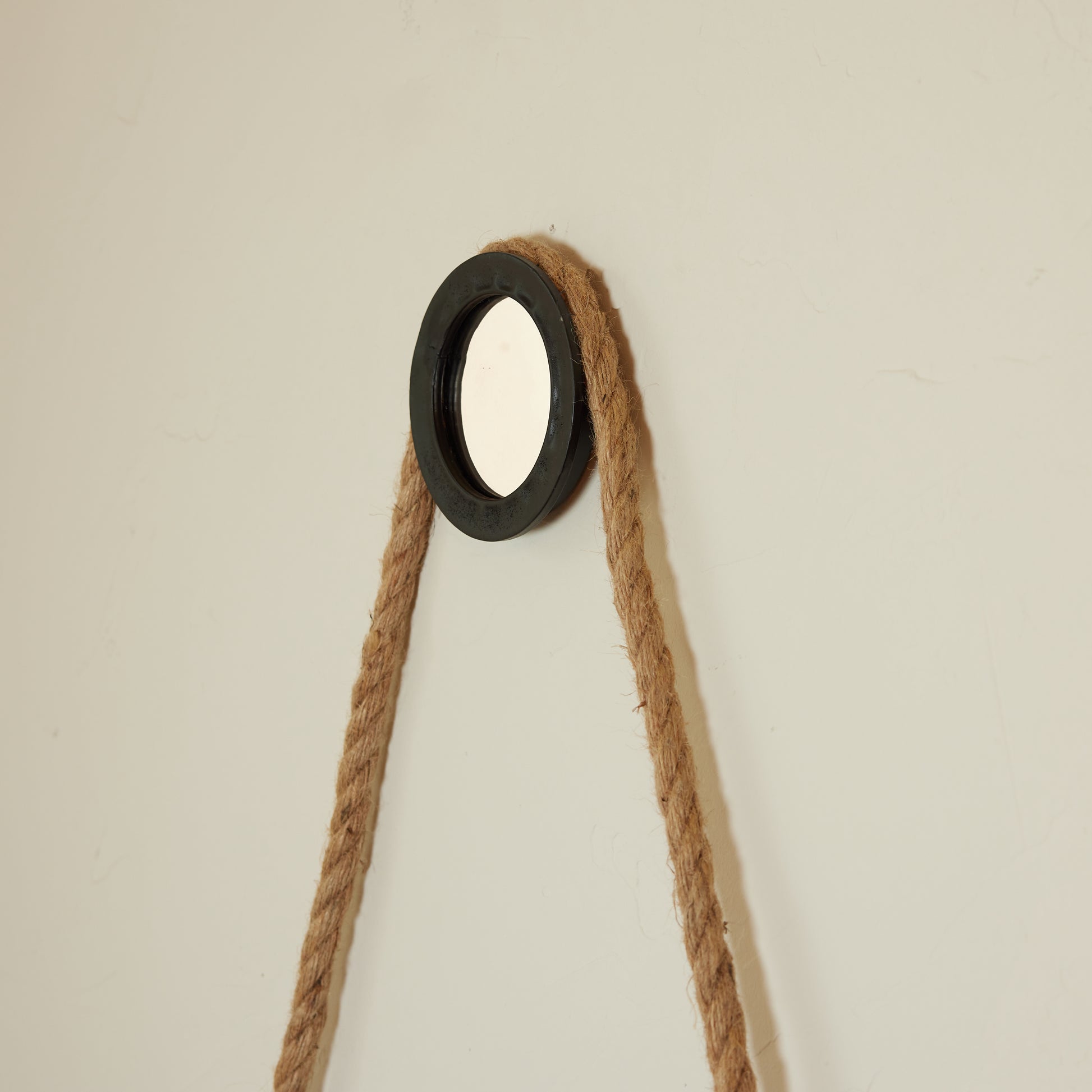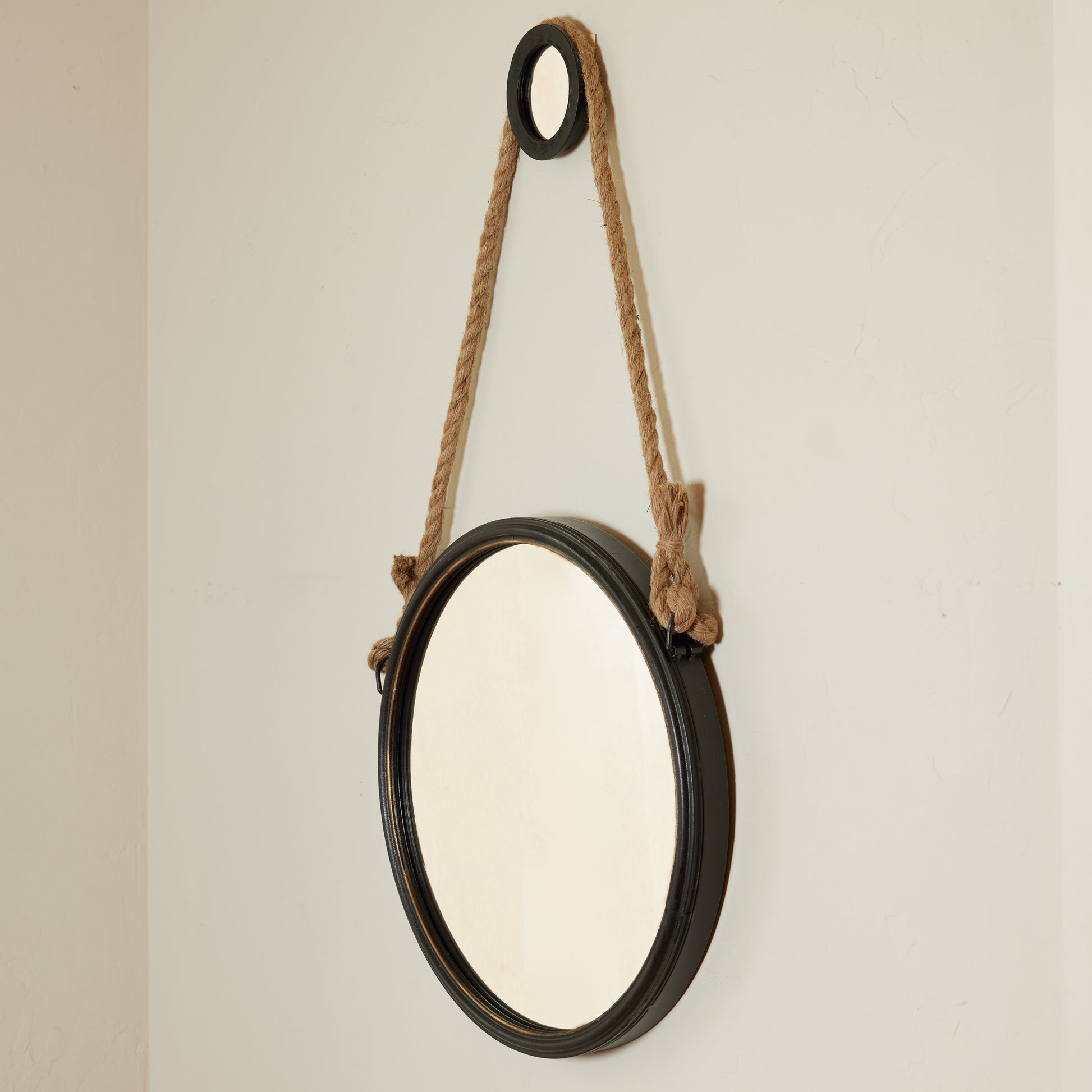 This round mirror combines classic materials with modern elements to create a statement in your home. This piece features a simple grey metal frame, suspended from durable rope looped over a matching hanger peg. This mirror is a versatile size for decoration or everyday use.