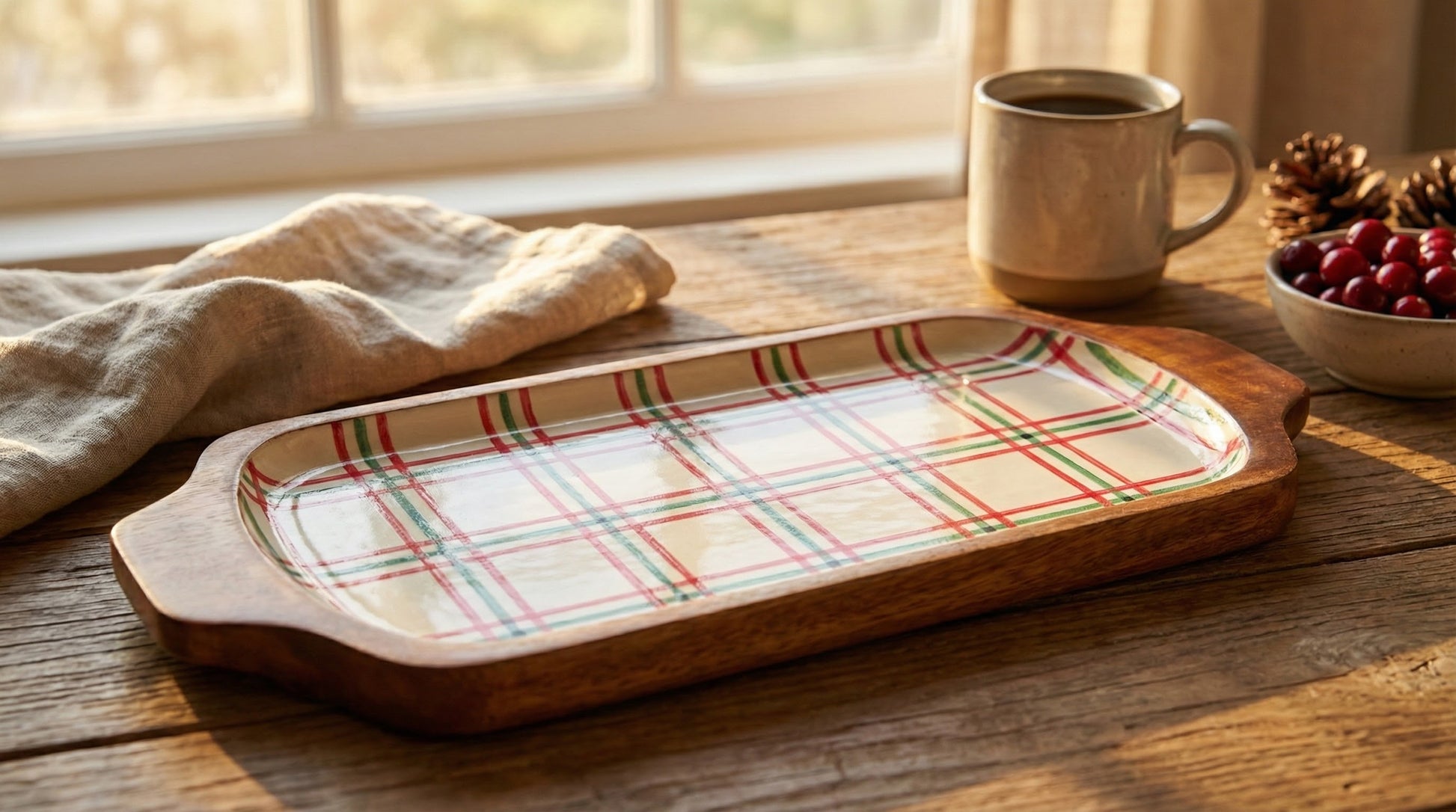Add a festive touch to your gatherings with this beautifully crafted oval tray. Made from rich mango wood, it features a classic red, green, and white plaid pattern that captures the warmth and cheer of the holiday season. Perfect for entertaining, serving appetizers, or displaying seasonal décor, this tray blends functionality with timeless farmhouse style.