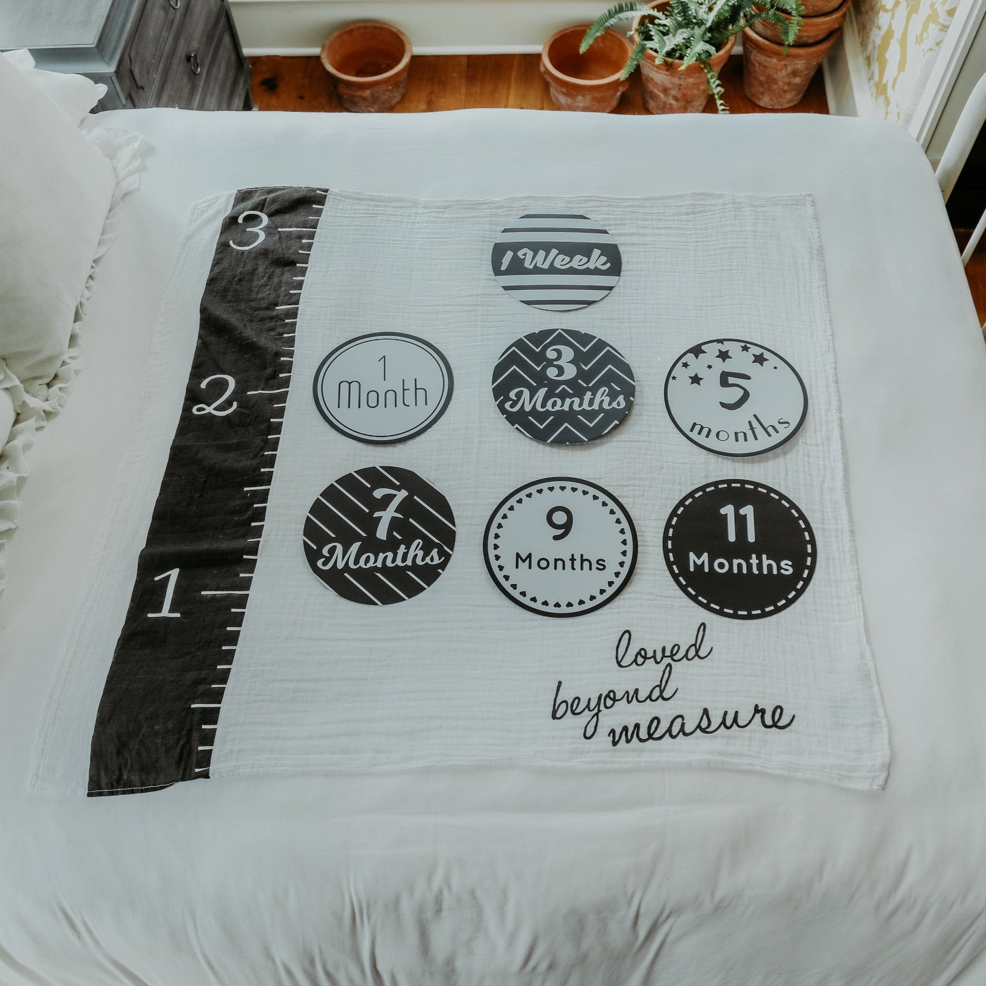 Size: 1 Large Muslin Blanket (40x40") + 7 double-sided cards with 14 milestones.