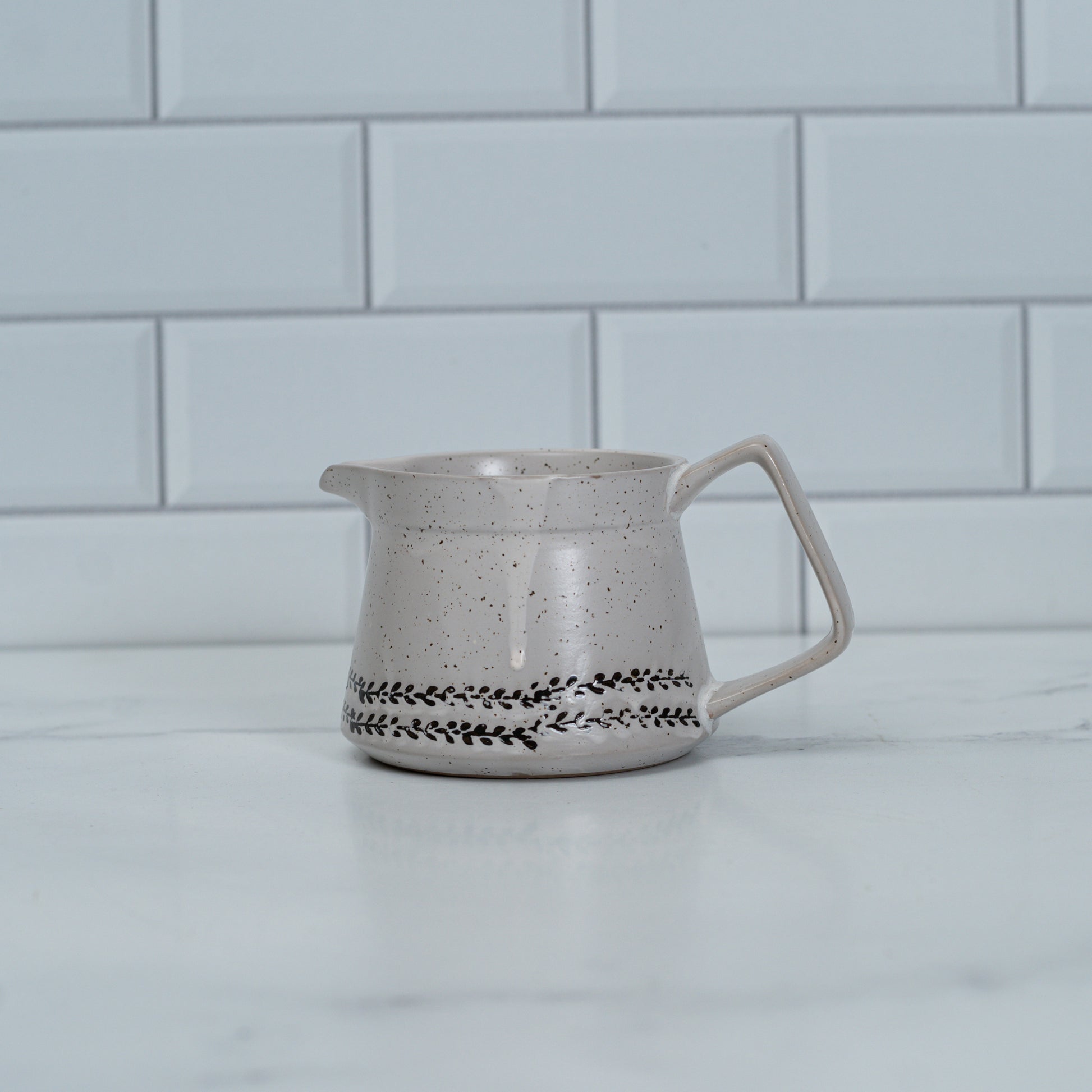 This stoneware creamer is perfect for any table. The white and blue color is beautiful, the material is 100% stoneware, and has a fun handle that makes for easy pouring.