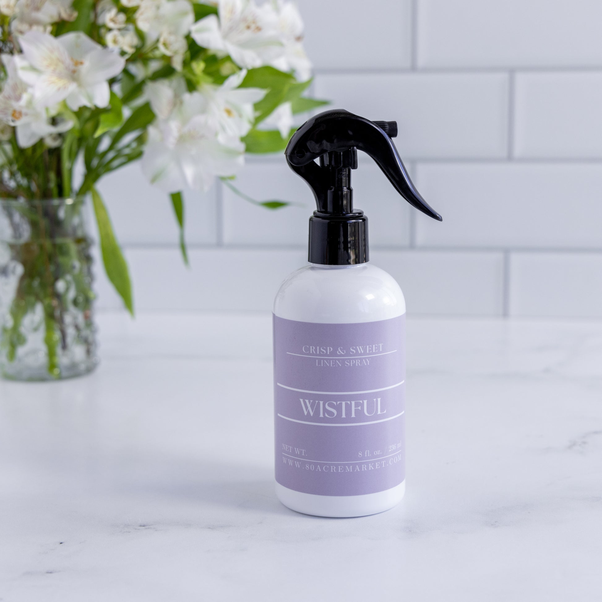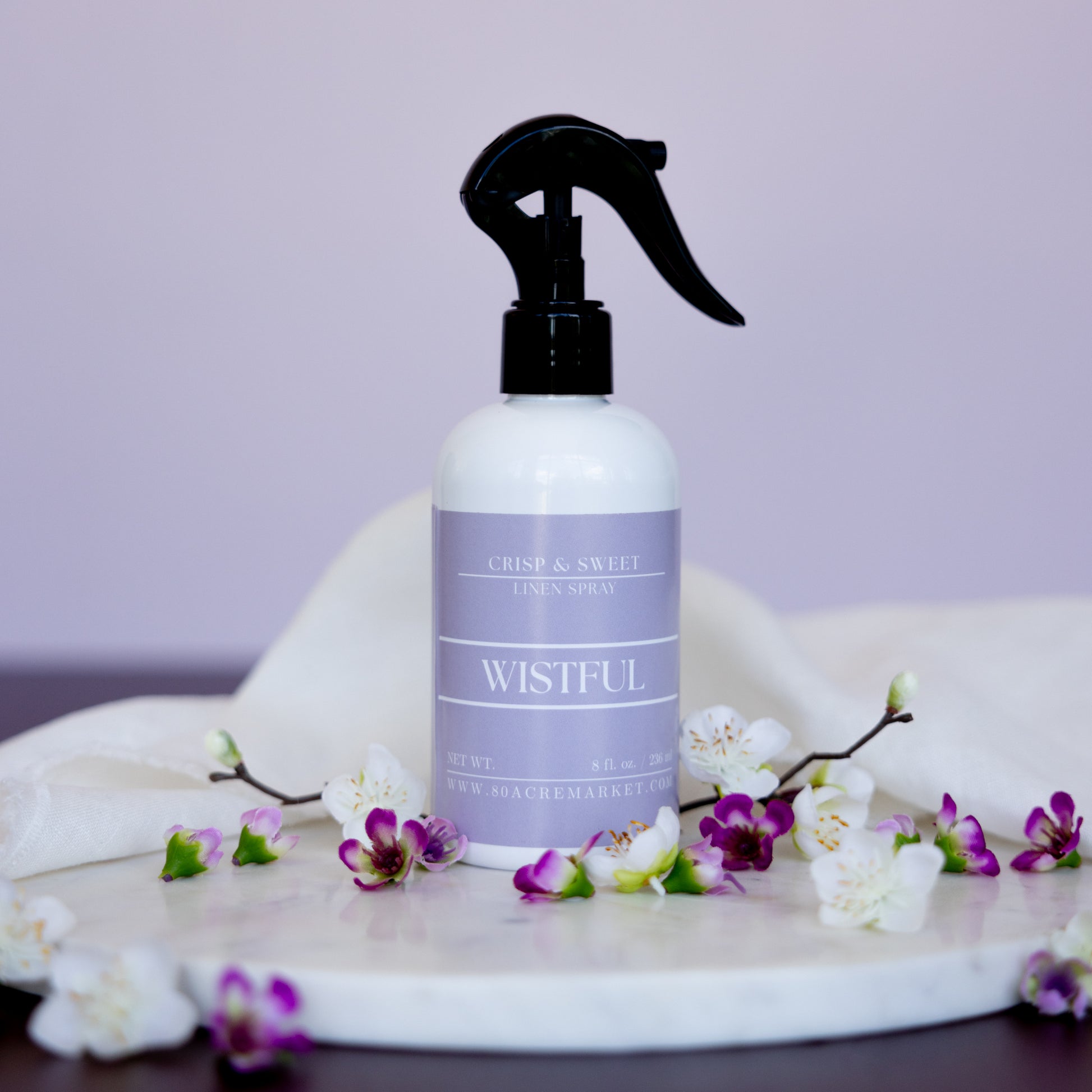 Our Wistful Signature Scent Linen Spray has a fruity blend of Tangerine, Fuji Apple, Pomelo, Pink Peony, and Sunflowers with a touch of calming Musk and White Cedar.