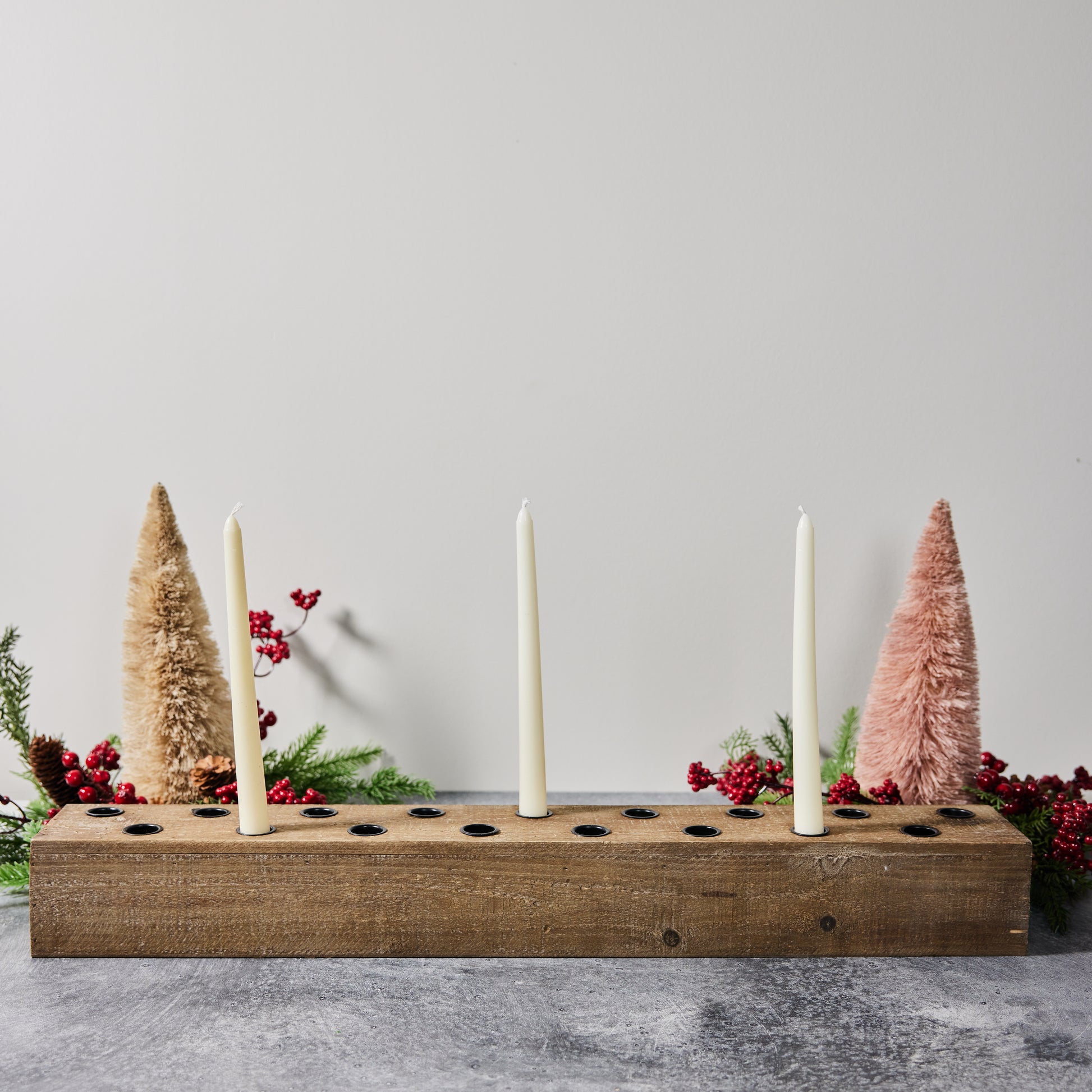 Our Wood Taper Holder is a chic, rustic addition to any room. Richly crafted from quality fir wood with a brown finish, this piece stands 28"L x 3-3/4"W x 3-1/4"H, making it the perfect size for tabletop or mantle placement. Its unique texture and intricate detailing are sure to bring a touch of sophistication to any space.